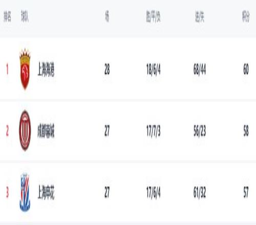 27轮之后,上海海港以60分排名榜首,成都蓉城、上海申花分别以58分、57分排名第2、3位。积分只差了2分,让上海海港、成都蓉城都在亚冠轮休了主力,而排名第三的上海申花则以主力阵容出战。