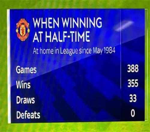 英超历史上,坐镇主场的曼联若是半场领先,最终都能保持不败。曼联上次在联赛主场半场领先,最终还输球,得追溯到1984年5月。最近41年,曼联在主场的联赛半场领先时,389战355胜34平0负。若没有拉门斯的压哨2连扑,曼联这项辉煌的纪录将成为历史……