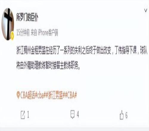 据媒体人所罗门的臣仆报道,浙江男篮在经历了一系列的失利之后终于做出改变,主帅丁伟指导下课,球队将由外籍助教(亚历山德罗斯·法莱卡斯)暂时接替主教练职务。不过这一消息还未被浙江俱乐部确认,也许稍后会进行官宣。
