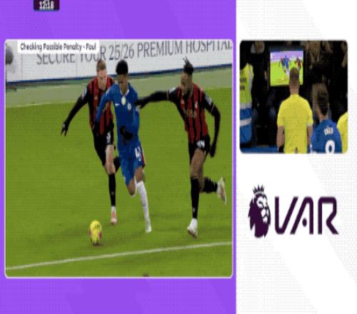 第12分钟,裁判叫停比赛,VAR介入,慢镜头显示,埃斯特旺突入禁区后,和塞梅尼奥有一个明显的身体对抗后倒地,裁判回看后判罚点球。