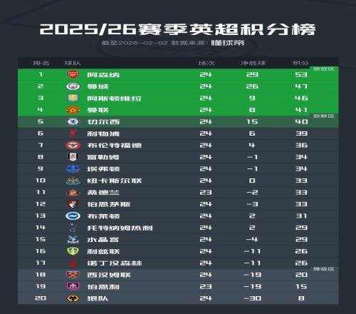 北京时间2月2日,2025/26赛季英超联赛结束了第24轮的绝大部分比赛,积分榜的形势也产生了进一步的变化。