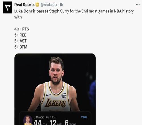 除此之外,东契奇超越库里成为NBA历史上单场拿下至少40分5篮板5助攻5记三分第二多的球员。
